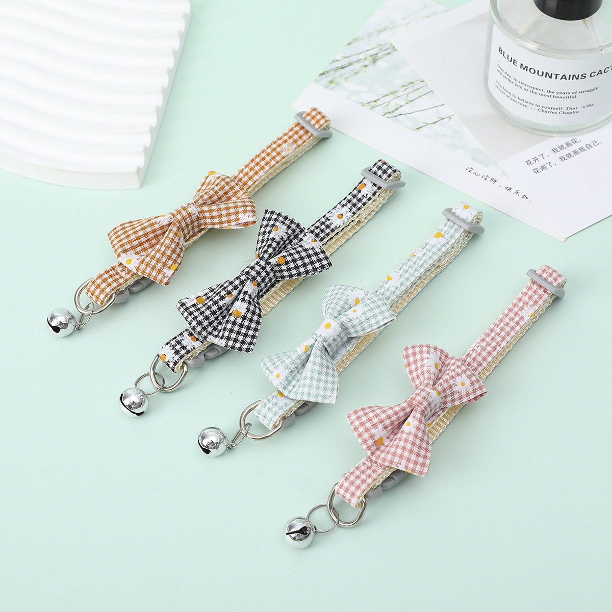 Kerah Hewan Peliharaan Kucing Anjing Kotak-kotak Bunga Daisy Pita Kupu-Kupu Kalung Bel yang Dapat Disesuaikan Pabrik Grosir
