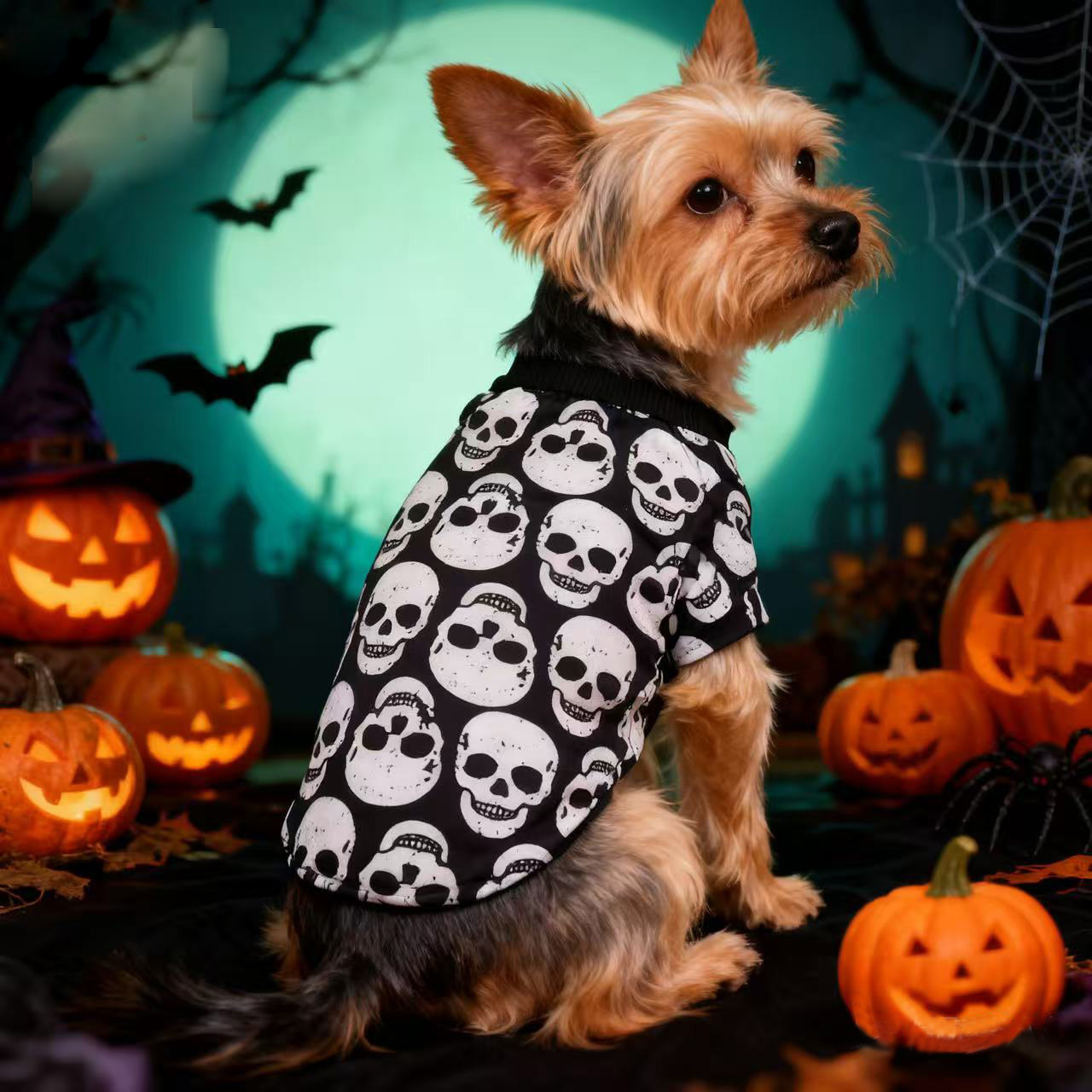 Baju hewan peliharaan lintas batas, pakaian anjing hangat rompi, baju kucing, baju ikat celup tengkorak pola Lucu Halloween, pakaian hewan peliharaan lintas batas
