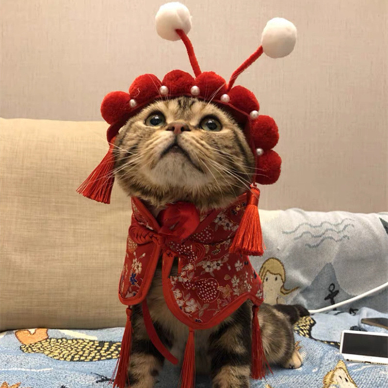 Kucing Tang Pakaian Han Dekorasi Kepala Putri Gaya Tiongkok Selendang Penutup Kepala Anjing Anjing Kecil Alat Peraga Foto Produk Hewan Peliharaan