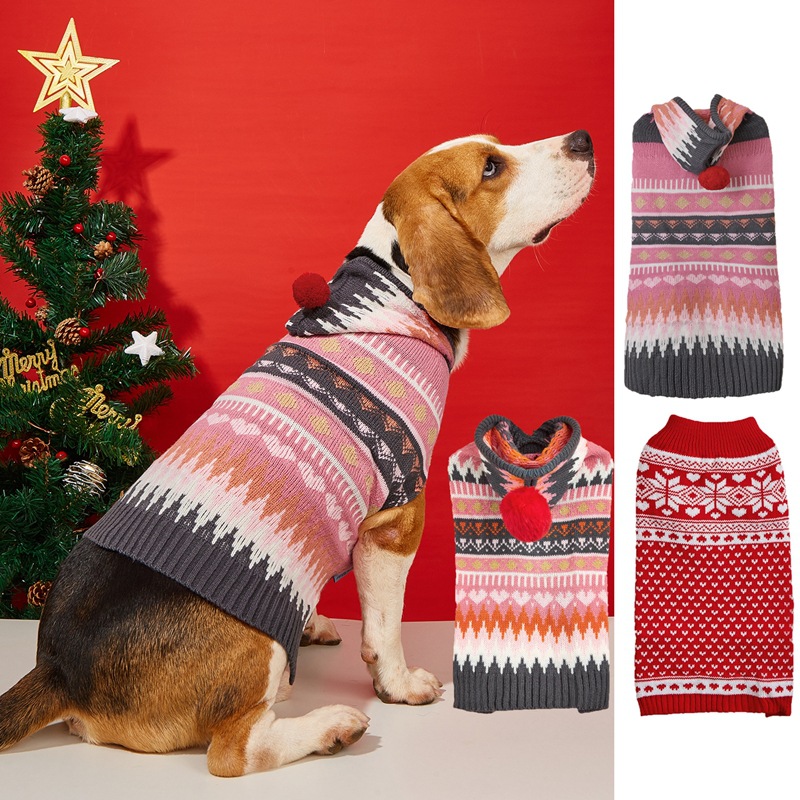 Amazon cross-border sweater bertudung merah mawar lembut rajutan bola rambut cinta kepingan salju bergaris pakaian anjing peliharaan