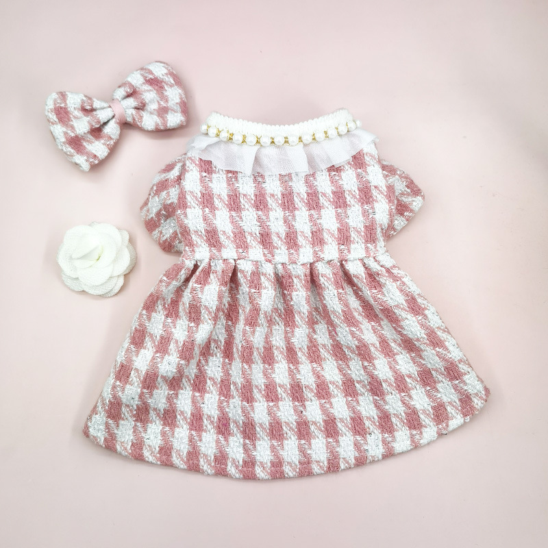 2025 Pakaian Anjing Baru Musim Panas Pakaian Kucing Gaun Putri Kotak-kotak Hitam Putih Renda Kupu-Kupu Topi