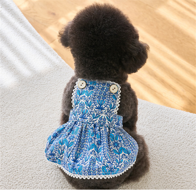 Musim Semi dan Musim Panas Hewan Peliharaan Anjing Kucing Biru dan Putih Porselen Bercetak Rok Pakaian Perlengkapan Hewan Peliharaan Teddy Bichon Pakaian Grosir
