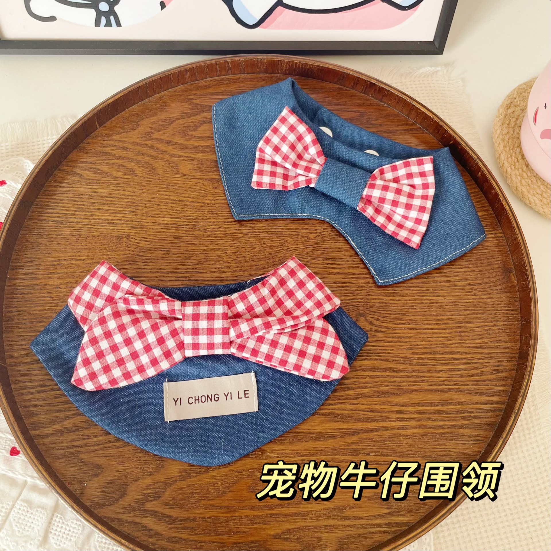 Handuk Segitiga Denim Hewan Peliharaan Model Baru Handuk Air Mulut Kotak-kotak Anjing Kecil dan Menengah Dekorasi Kerah Kupu-Kupu Anjing Kucing