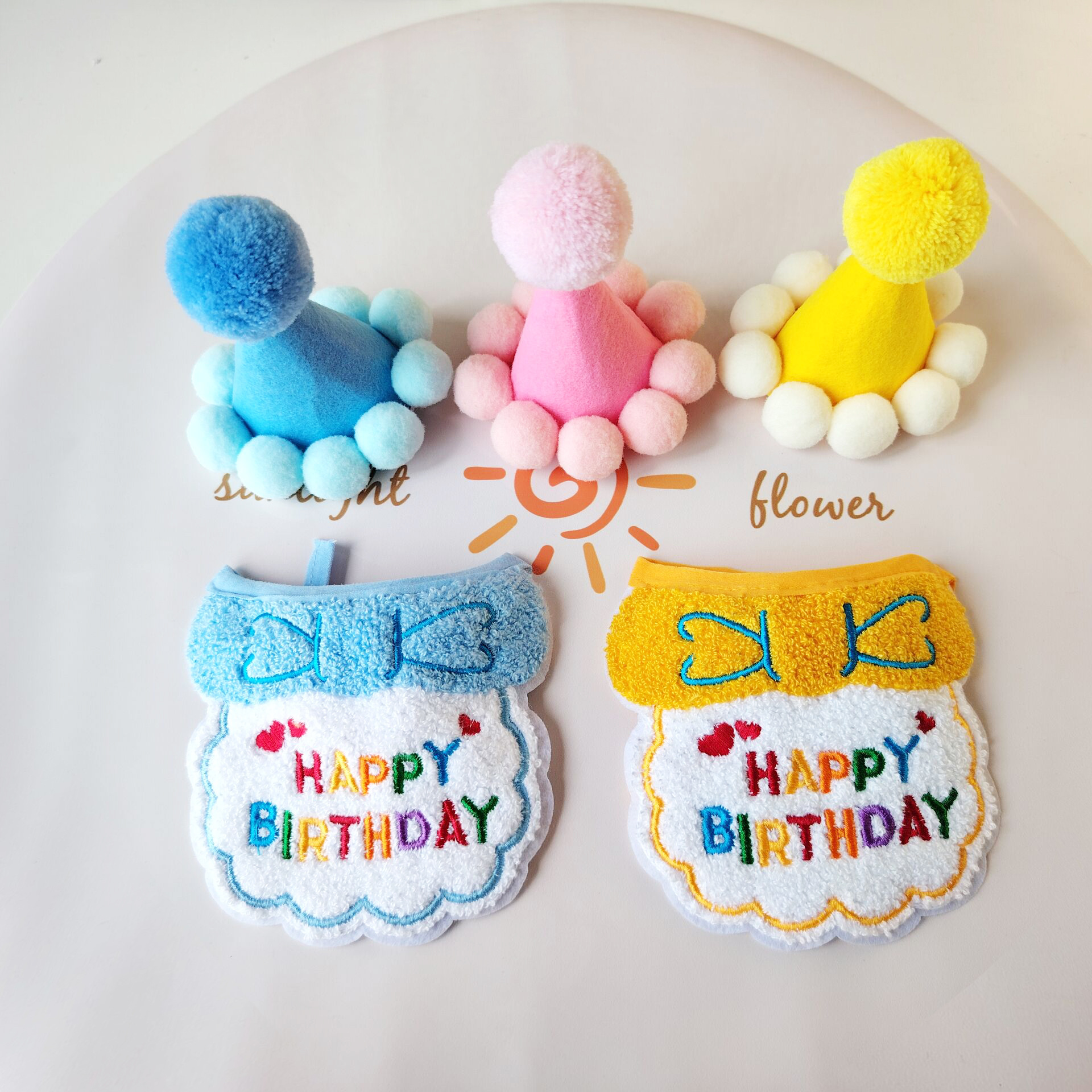Topi ulang tahun gaya Korea, topi bib liburan anjing dekorasi kucing baru topi hewan peliharaan bola bulu