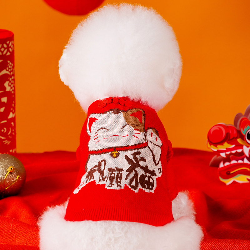 Sweater kucing keberuntungan lengan terbang kecil Tahun Baru dan musim gugur dan musim dingin sweter kucing peliharaan meriah Tahun Baru pakaian anjing