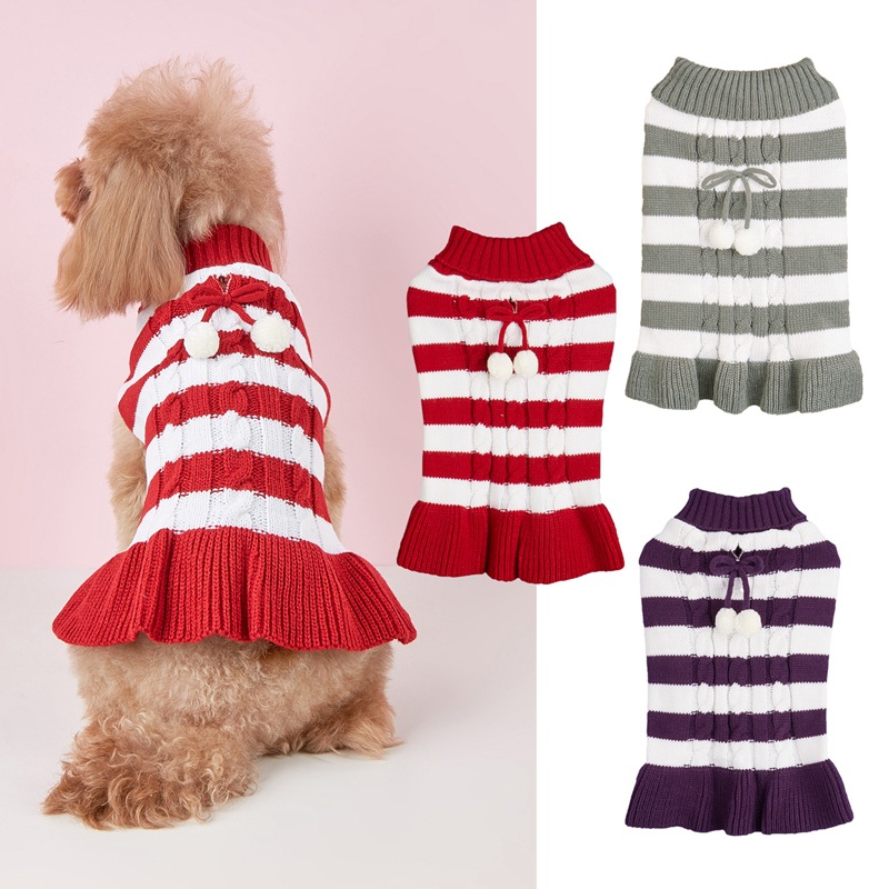 Musim gugur musim dingin klasik warna kontras rajutan bergaris busur bulu bola rok Bixiong Bomei anjing kecil sweter hewan peliharaan
