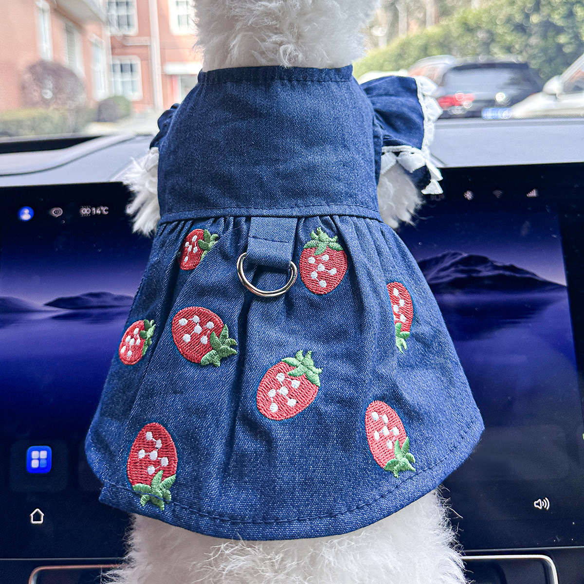 现货宠物小狗狗猫咪衣服春夏装可牵引刺绣草莓连衣裙厂家直销批发