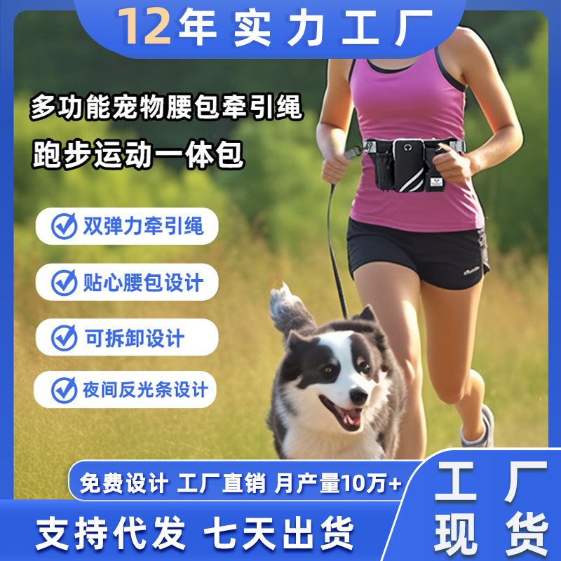 Tas pinggang hewan peliharaan, tas pinggang tali traksi, sabuk anjing berjalan olahraga lari reflektif malam multifungsi latihan hewan peliharaan luar ruangan
