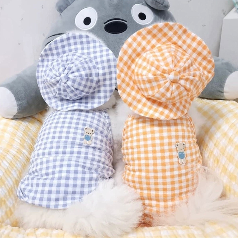 Pakaian hewan peliharaan baru Bomei Teddy French bucket topi mantel anjing kecil dan sedang baju kotak-kotak topi setelan dalam stok grosir