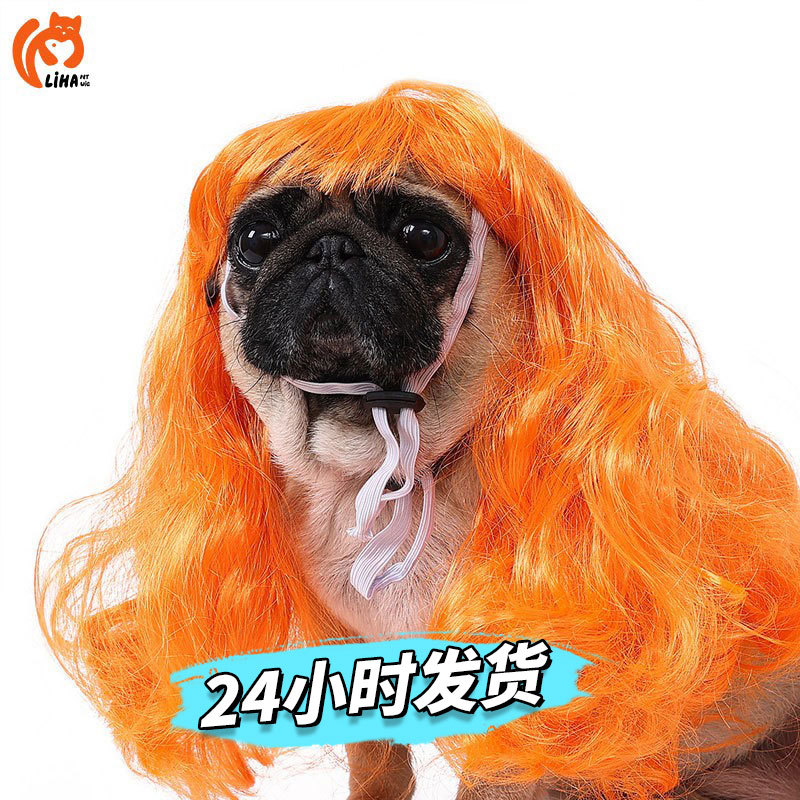 Rambut palsu lurus hewan peliharaan, wig anjing kucing lintas batas perlengkapan hewan peliharaan pesta Halloween kepala gelombang