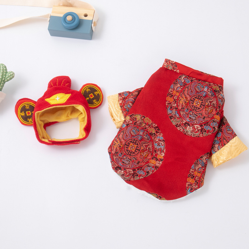 Pakaian anjing musim gugur dan musim dingin hangat Tahun Baru topi Dewa Kekayaan meriah dicetak setelan Tang pakaian kucing grosir