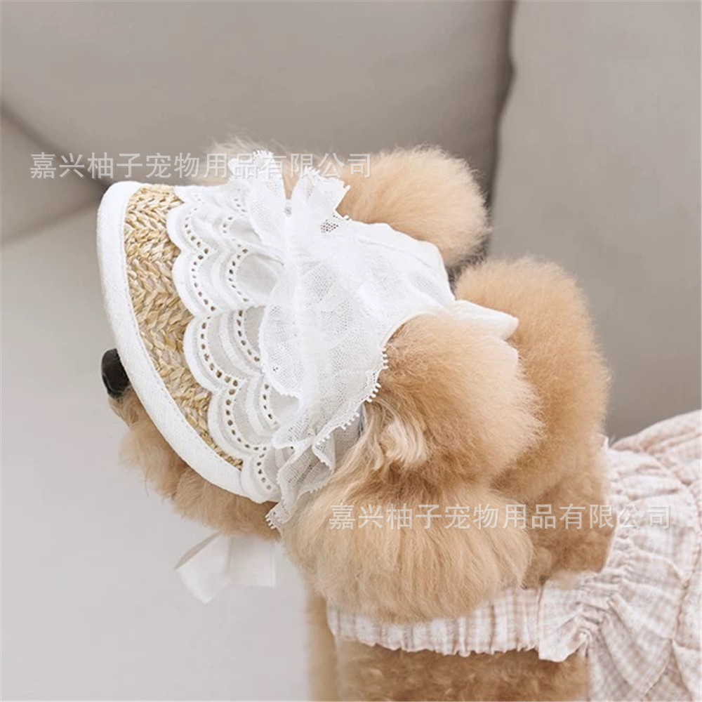 Topi jerami Prancis hewan peliharaan, topi pelindung mata kucing dan anjing kecil beruang teddy, topi matahari renda dapat disesuaikan