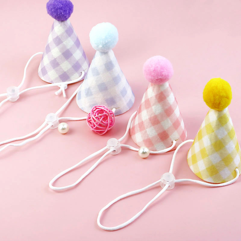 Topi ulang tahun hewan peliharaan dari bahan felt, grosir dari pabrik, untuk anjing kecil, bayi berusia satu tahun, motif kotak-kotak, bola bulu, pesta ulang tahun