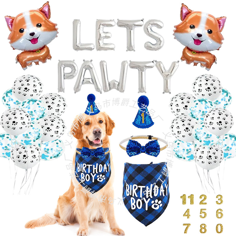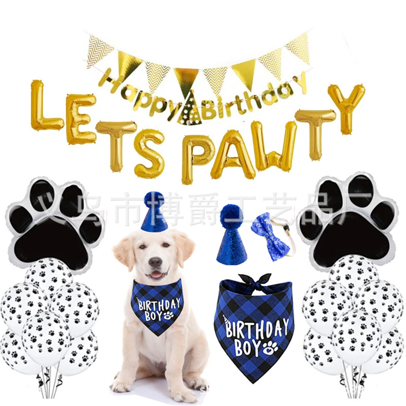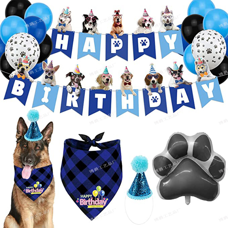 Setelan dekorasi pesta ulang tahun hewan peliharaan topi handuk air liur dekorasi dasi kupu-kupu cakar anjing balon segitiga tata letak bendera tarik
