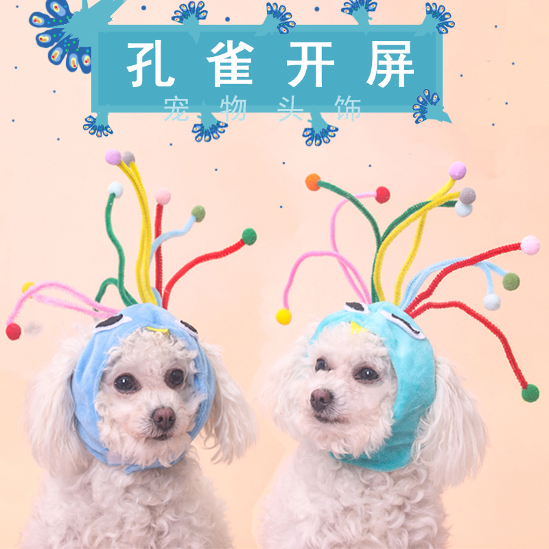 Topi merak layar terbuka baru untuk hewan peliharaan topi mewah kucing anjing penutup kepala hiasan kepala hewan peliharaan topi anjing penutup kepala kucing kecil