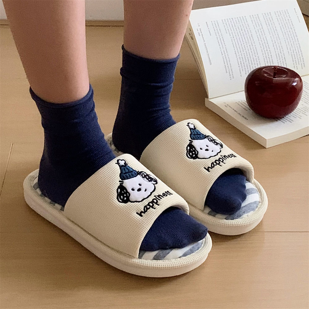 Sandal Katun dan Linen Anjing Ins Lucu Pria Wanita Sepatu Lantai Penyerap Keringat Rumah Pasangan Bergaris Warna Campuran Musim Semi dan Musim Panas