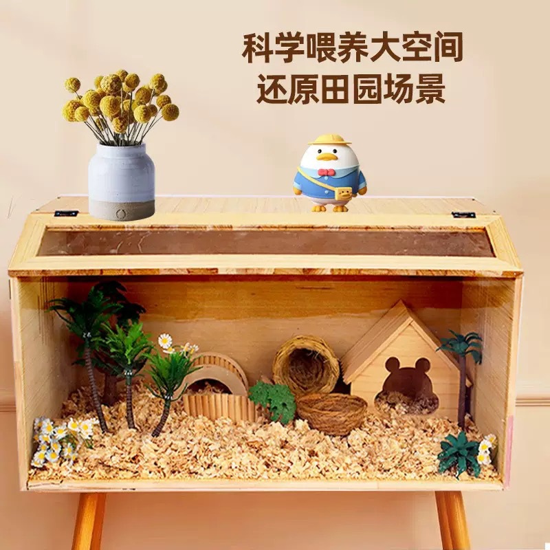 Kandang Hamster Kayu Solid Rumah Besar Puri Tiga Lantai Vila Terbuka Kecil Hewan Peliharaan Kecil Beruang Emas Tangga