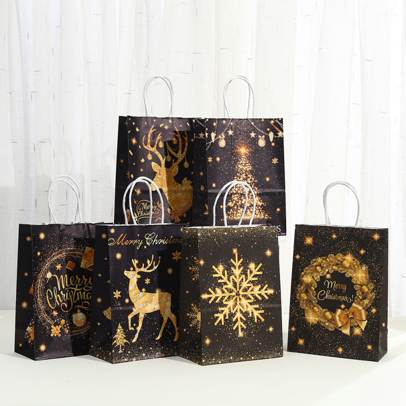 外贸新款圣诞节手提袋黑色烫金高级感礼品袋派对糖果伴手礼包装袋