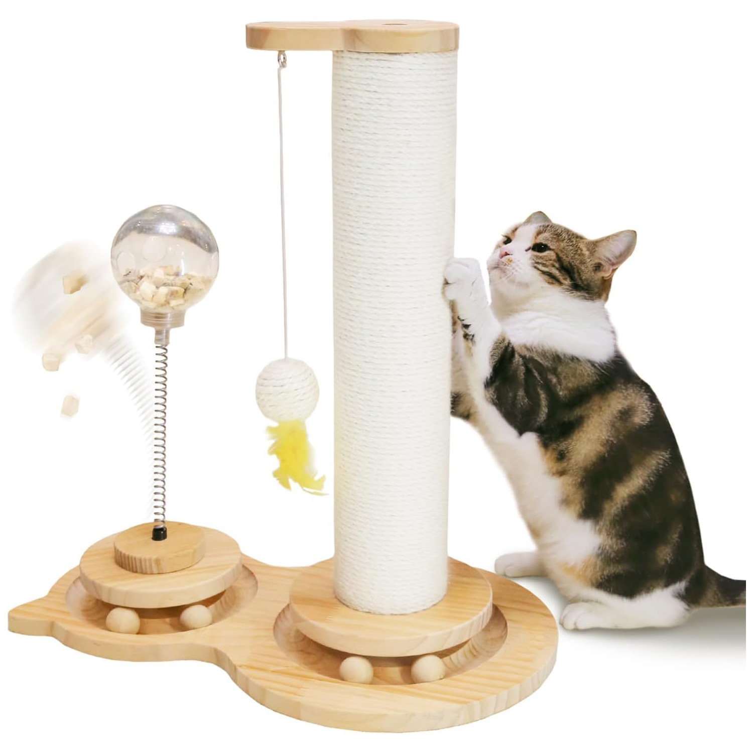Mainan penggaruk kucing, kayu tempat cakar kucing lapisan ganda meja putar dengan bola interaktif dan bola gantung