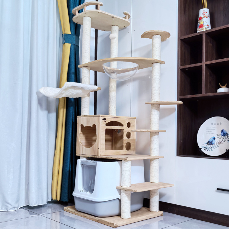 Kayu Pinus Semua Kayu Solid Besar Kucing Rak Climbing Villa Satu Kamar Ruang Angkasa Kolom Sisal Kuning Lemari Sands Kucing Bertingkat