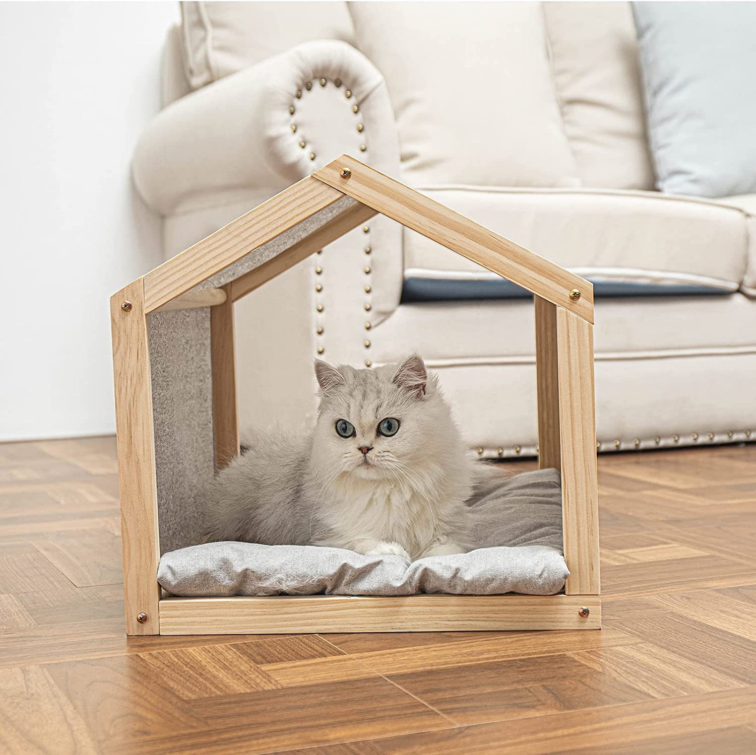 Sarang kucing Vila hewan peliharaan dalam ruangan, rumah kucing tertutup kayu padat dapat dilepas dan dicuci