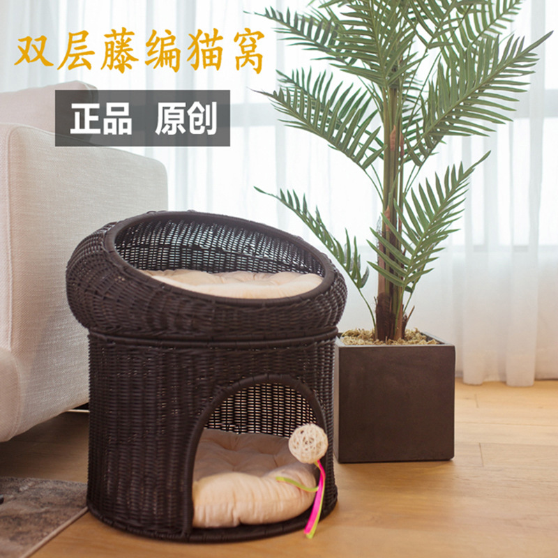 Empat musim universal Musim Panas semi-tertutup dua lapisan rumah kucing desain meja samping tempat tidur sarang kucing rotan rumah tertutup