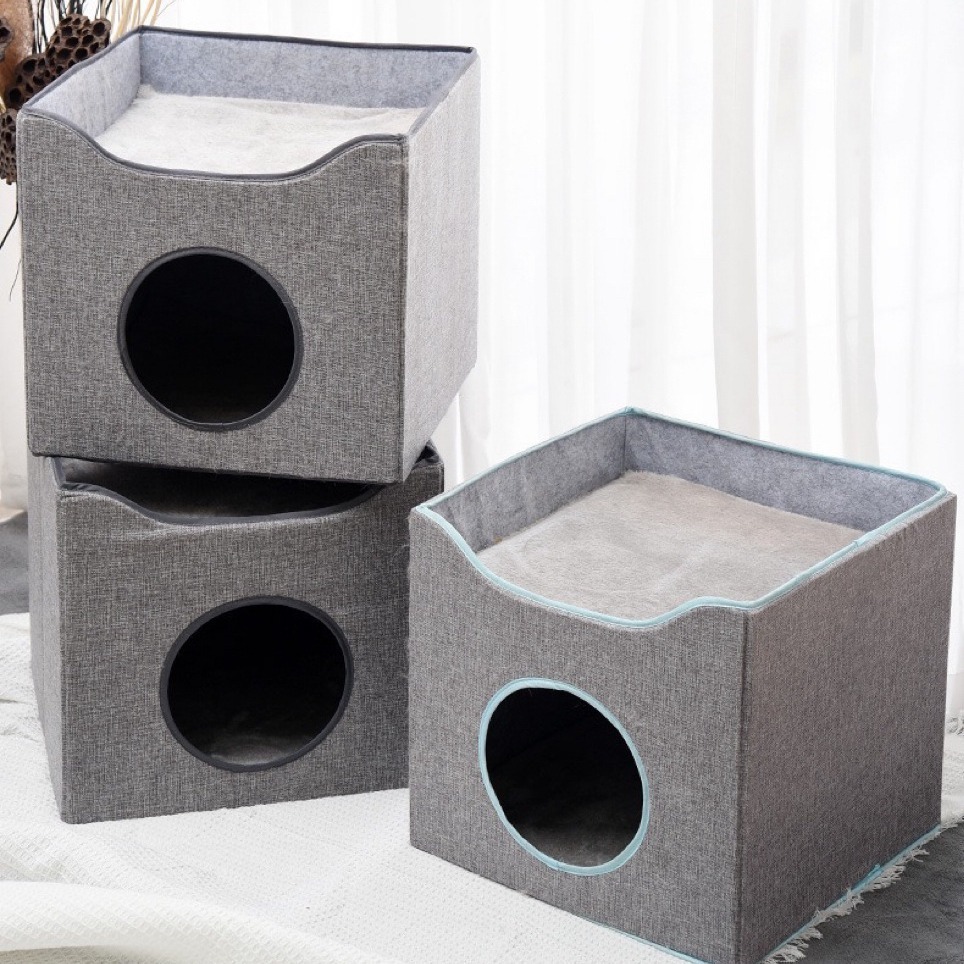 Sarang kucing lapisan ganda dapat dilipat, sarang hewan peliharaan ruang besar kandang tertutup empat musim rumah kucing universal Villa