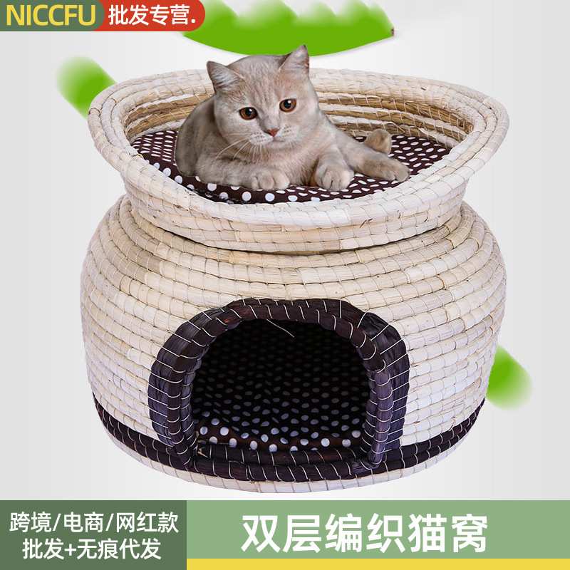 NC sarang kucing dua lapisan, sarang anjing anyaman bernapas sarang hewan peliharaan semi-tertutup rotan kucing sarang kucing rotan kandang kucing