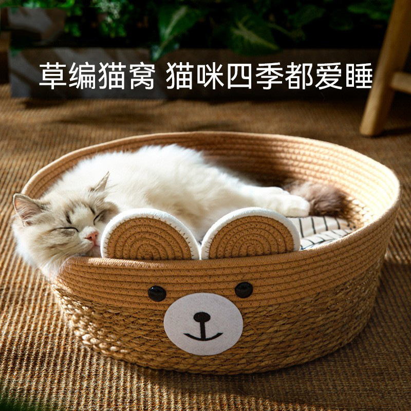Sarang kucing beruang rotan, sarang anjing musim panas lucu, tikar buatan tangan, anyaman jerami semi-tertutup, sarang kucing besar hewan peliharaan