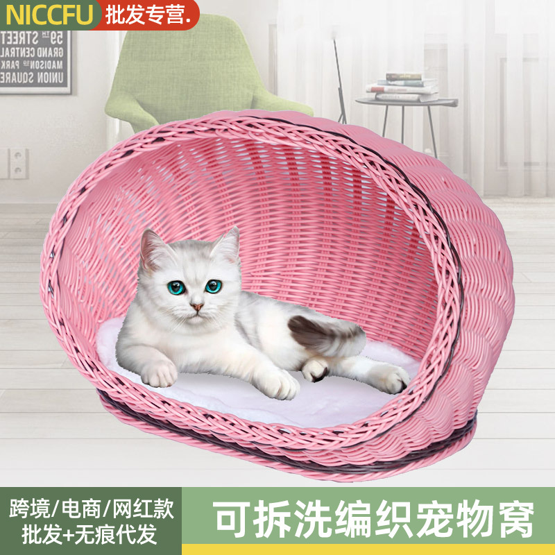 Sarang kucing rotan universal empat musim sarang hewan peliharaan semi-tertutup jaring tempat tidur kucing besar sarang anjing anyaman merah perlengkapan hewan peliharaan grosir