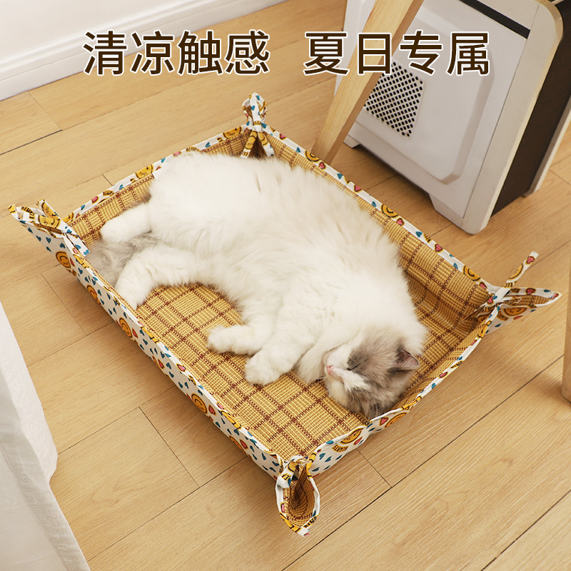 Tempat tidur kucing rotan, sarang anjing keren bersirkulasi udara, sarang kucing jerami Jepang segar, sarang anjing musim panas