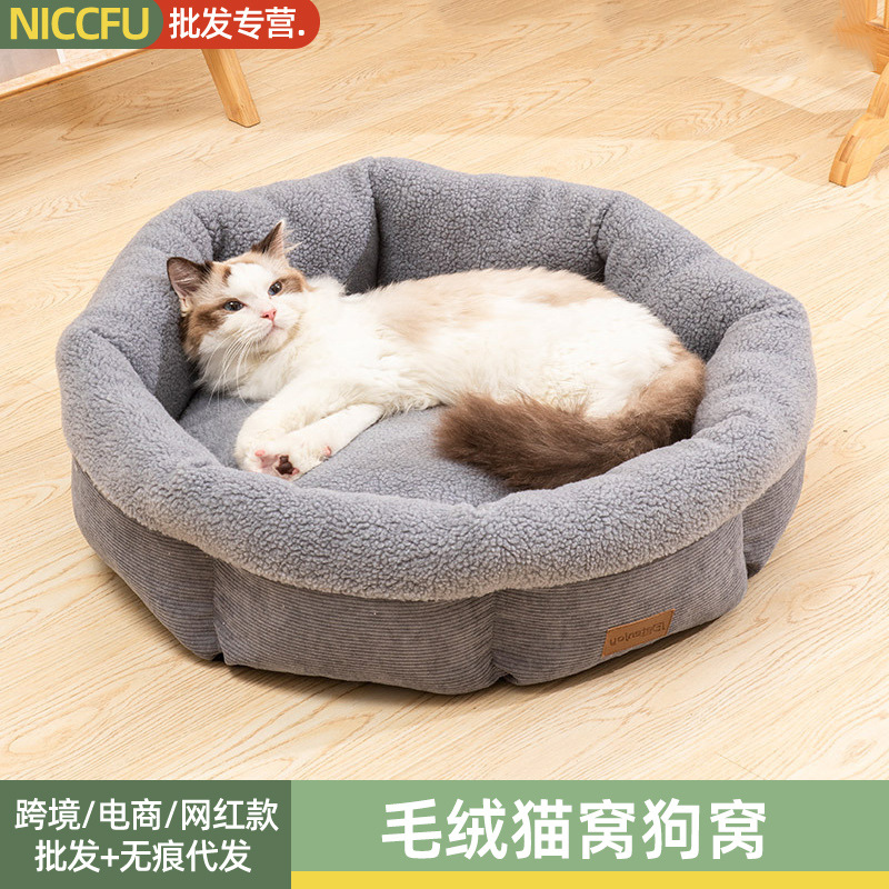 NC sarang kucing mewah sarang anjing lambswool hangat bulat setengah pak kandang kucing hewan peliharaan bulu bulat tikar hewan peliharaan