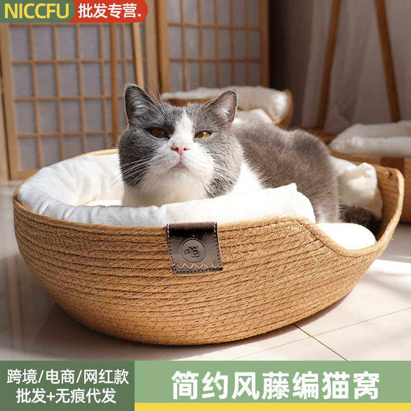 Sarang kucing panas lintas batas empat musim universal, sarang kucing peliharaan rotan dapat dilepas dan dicuci, perlengkapan kucing peliharaan