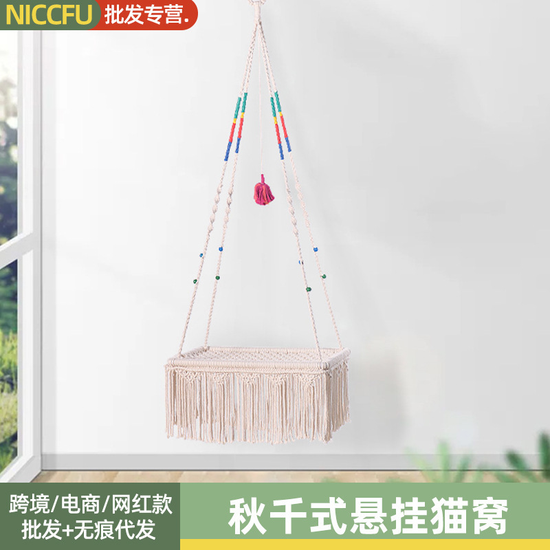 Tempat tidur gantung kucing, ayunan gantung sarang kucing renda tali katun sederhana kuat tahan lama tempat tidur gantung permadani tempat tidur hewan peliharaan