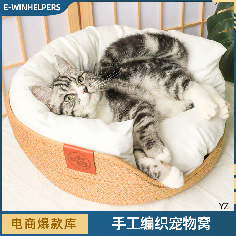 Sarang kucing anyaman universal empat musim, tempat tidur kucing tertutup penuh perlengkapan hewan peliharaan pagar hewan peliharaan