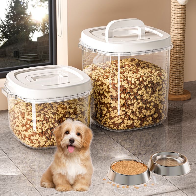 Kotak penyimpanan makanan hewan peliharaan, ember biji-bijian transparan, anti kelembaban, toples penyimpanan tepung bersegel, kotak makanan anjing peliharaan