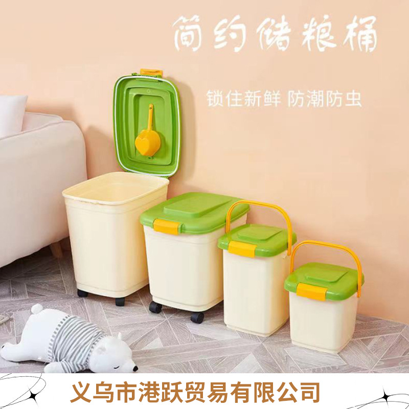 Ember penyimpanan makanan anjing peliharaan, ember penyimpanan gandum dengan roda tertutup tahan kelembaban makanan PP anjing kucing ember makanan grosir