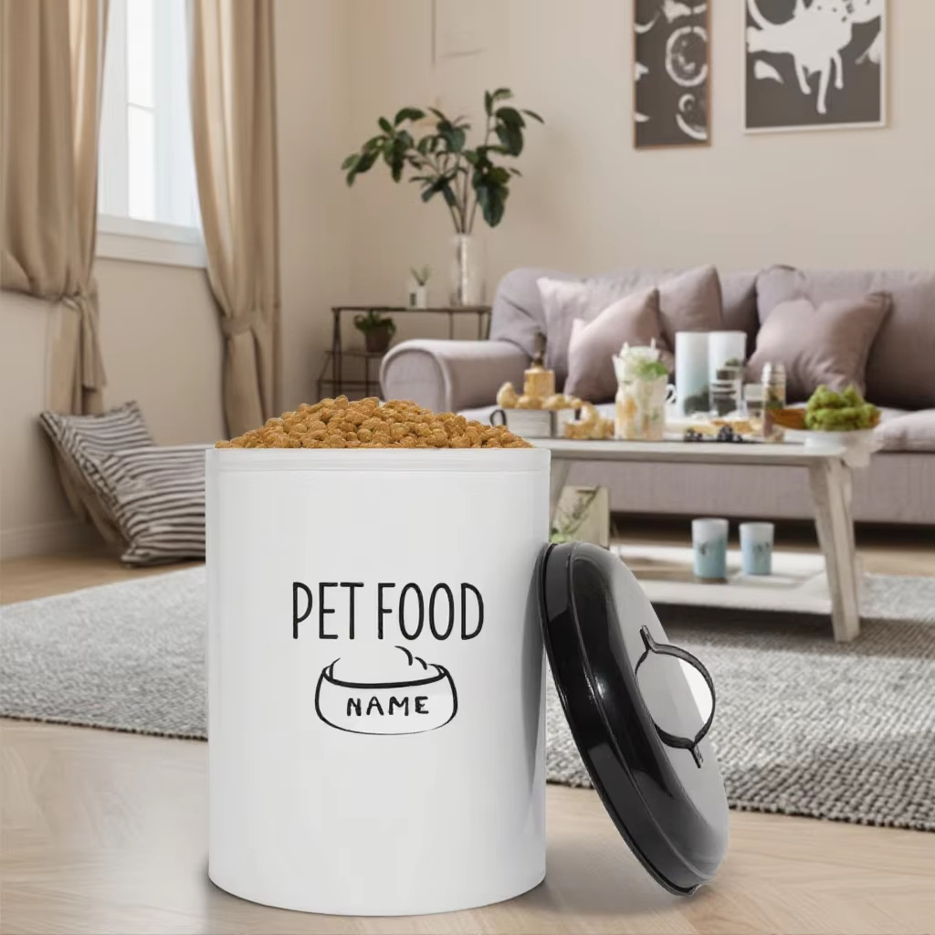 Ember Makanan Anjing Lintas Batas Bulat Kaleng Logam Hewan Peliharaan Kotak Penyimpanan Segel Kapasitas Besar Camilan Kucing dan Anjing Kotak Penyimpanan Warna Hitam Putih