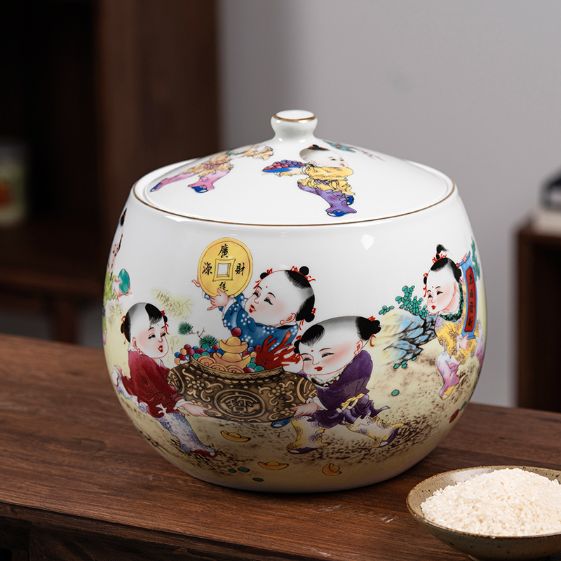 Jingdezhen Silinder Beras Keramik 15Kg Barel Penyimpanan Beras Tahan Air Anti Air Serangga Tertutup Rumah Tangga Retro Vintage