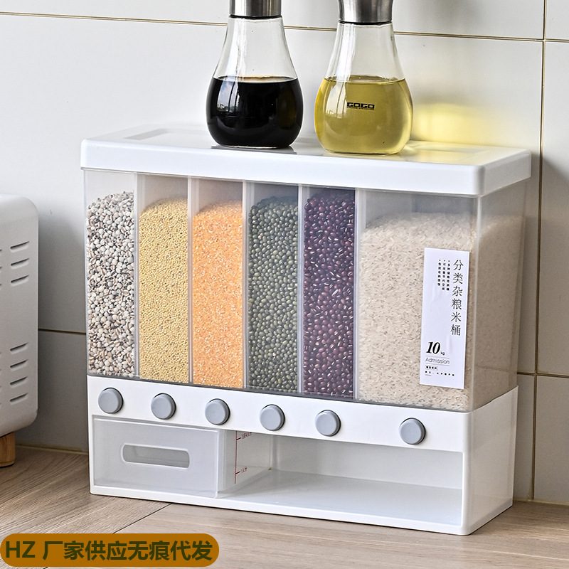 Ember beras 6 kisi, kotak penyimpanan beras rumah tangga, biji-bijian, anti serangga, tekanan terpasang di dinding, ember beras kapasitas besar