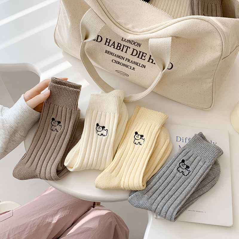 Kaus kaki wanita suxinaimin musim semi dan musim gugur bordir anak anjing setengah betis jarum ganda Dongdaemun Korea Selatan kaus kaki garis vertikal