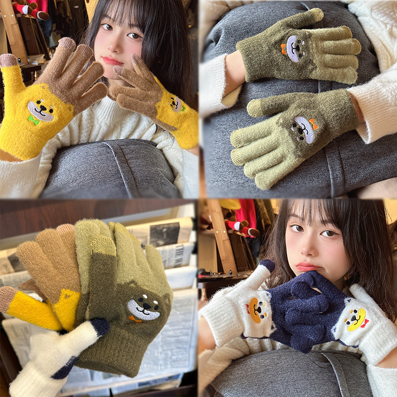 Shiba Inu ~ sarung tangan wol hangat, sarung tangan bersepeda kartun rajut musim dingin untuk pelajar, sarung tangan hangat tebal layar sentuh biru muda