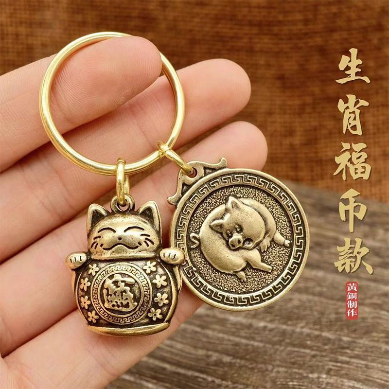 Gantungan kunci kucing keberuntungan, liontin zodiak logam campuran seng, dekorasi rantai kunci mobil gaya China
