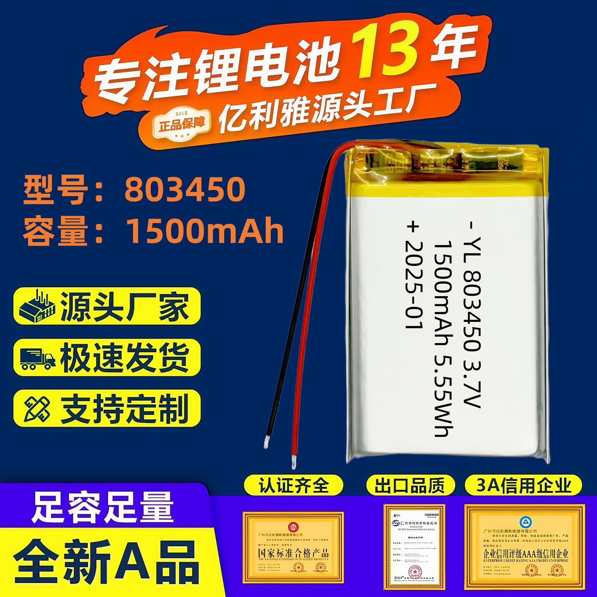 803450 Baterai Lithium Polimer 1500mAh Lampu Berkemah Bluetooth Audio Alarm Keamanan Baterai Lithium Isi Ulang