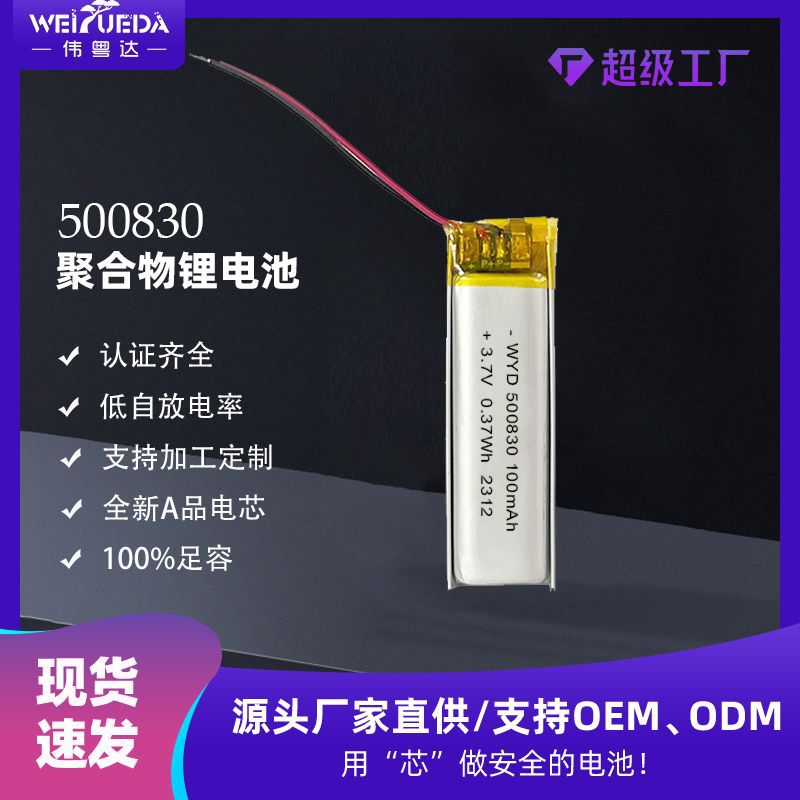 Baterai lithium polimer Weiyueda 500830 100mAh 3.7V untuk headset Bluetooth, alat kecantikan, dan speaker.