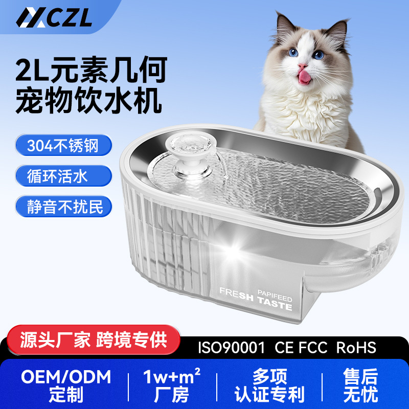 Dispenser air otomatis cerdas untuk hewan peliharaan, dispenser air geometris elemen dagu hitam, baja tahan karat tembus pandang novel