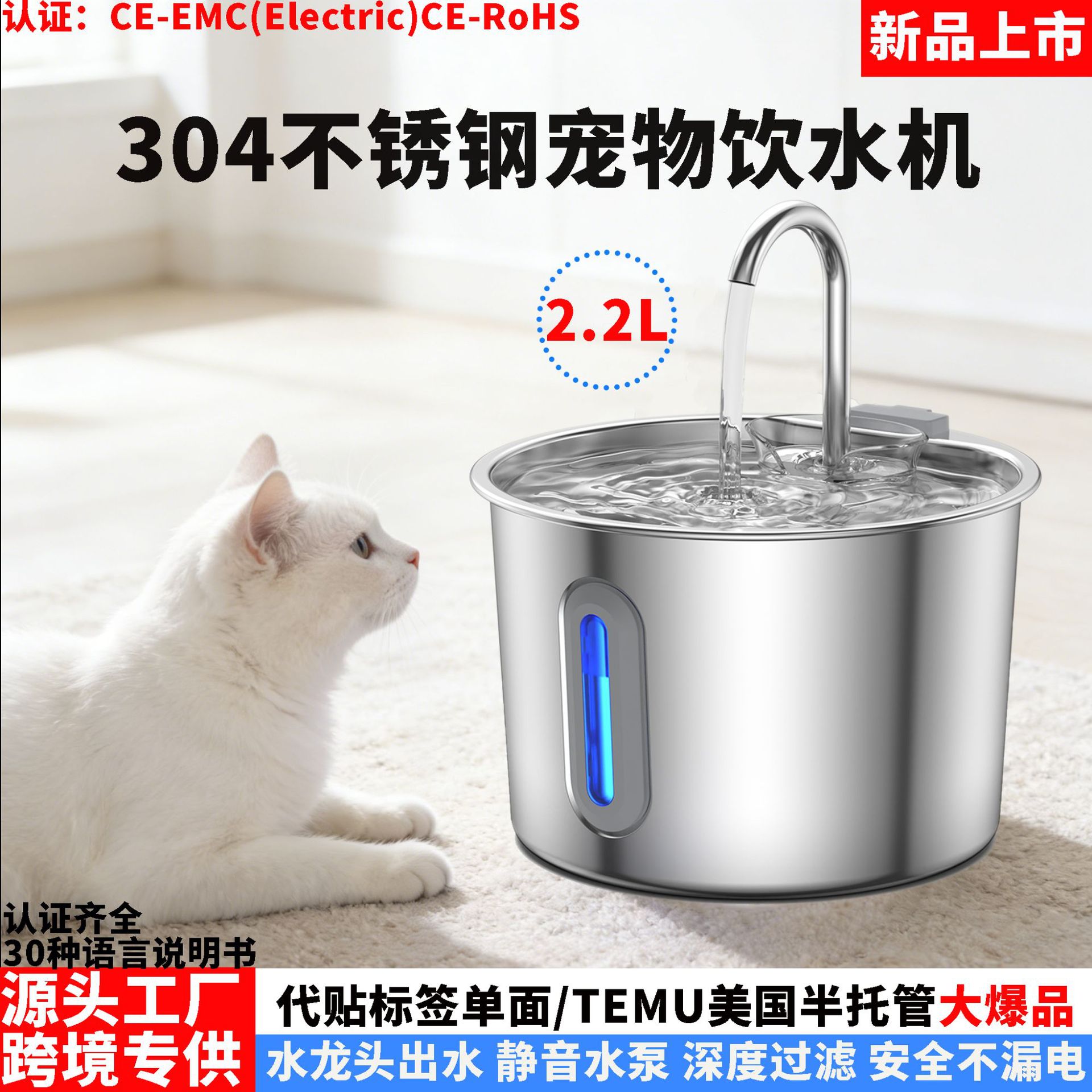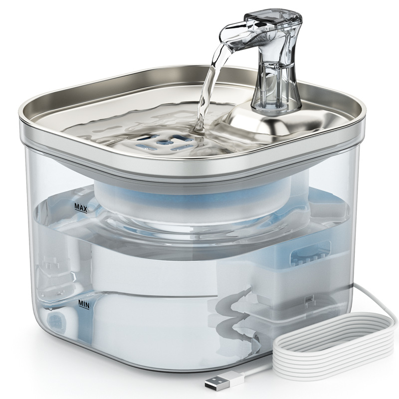 2025 Produk Baru Dispenser Air Hewan 2.2L304 Dispenser Air Kucing dan Anjing Stainless Steel Peredaran Otomatis Dispenser Air Kucing