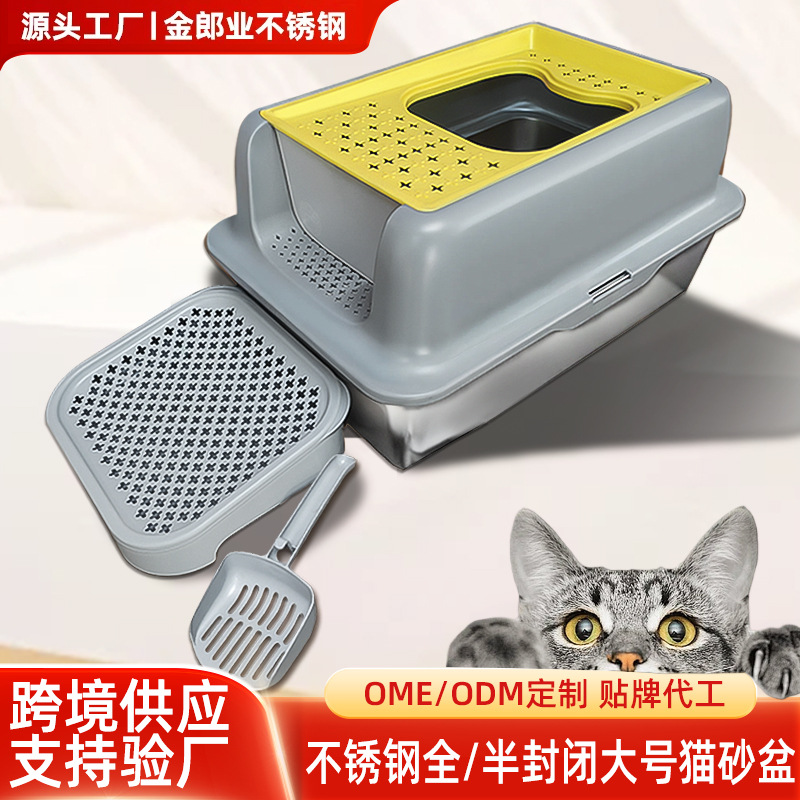 Kotak pasir kucing dari baja tahan karat, dapat dirakit, anti-cipratan, ukuran ekstra besar, semi-tertutup, untuk hewan peliharaan.