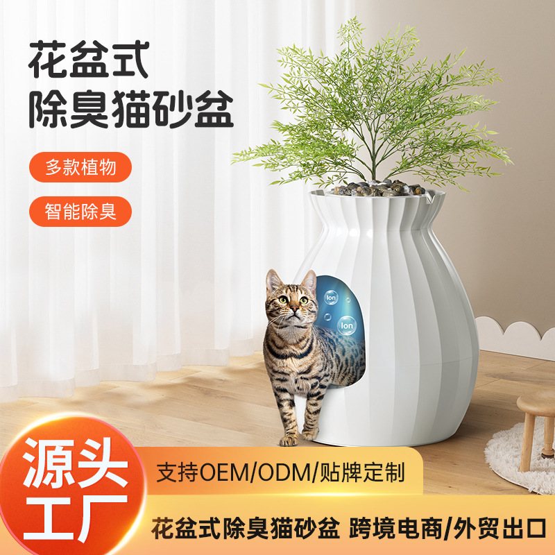 Kotak pasir kucing model tanaman tersembunyi lintas batas, toilet kucing pintar berukuran besar bergaya pot bunga dengan penghilang bau, tersedia, anti bau.