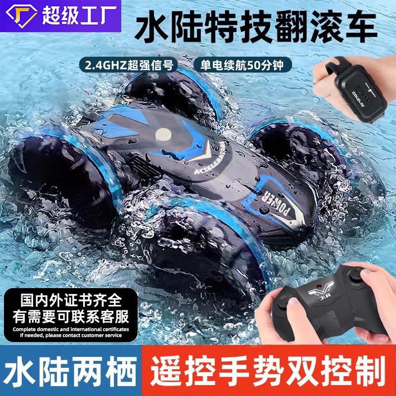 Roda lampu rc lintas batas baru air hiu dan darat stunt remote control mobil amfibi bergulir dua sisi mainan anak-anak grosir